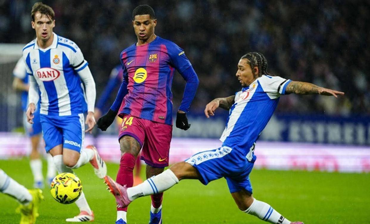 这还没完呢。 上半场快结束的时候,西班牙人左路传中,米拉在后点无人盯防的情况下头球攻门,距离近得吓人,球速也快。 我都准备欢呼了,结果加西亚又来了个神仙反应,单掌把球托出了横梁。 整个上半场,巴萨控球率是高,根本打不进对方禁区,全是安全球来回倒脚。 拉什福德在场上跟隐身了似的,莱万也接不到球。 反观西班牙人,射门次数比巴萨多一倍,机会也更好。 要不是加西亚,巴萨上半场就得落后。